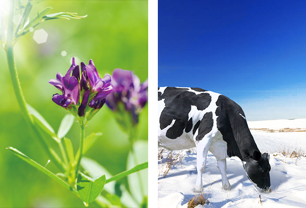 北纬45°的充足光照,让这里的植被拥有了高含量的植物粗蛋白;温带大陆性气候雨热同期的生长优势,使得奶牛最爱的紫花苜蓿牧草生长得十分茂盛;